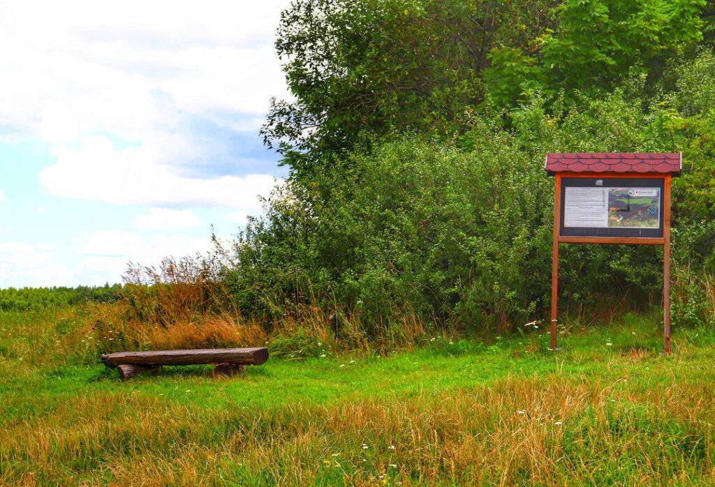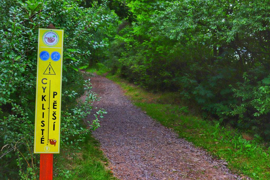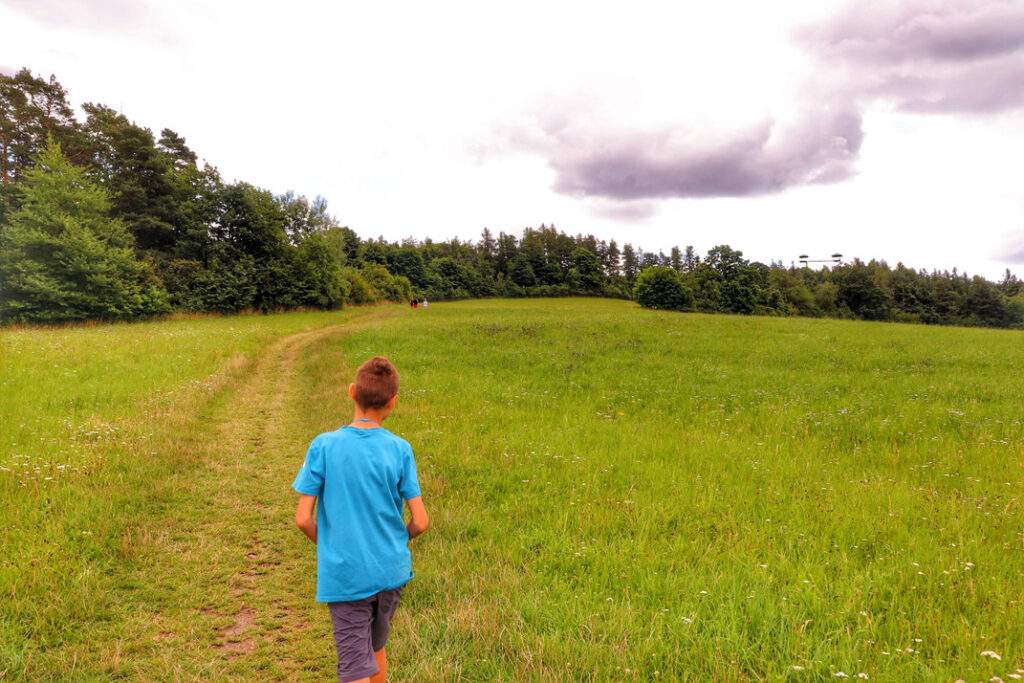 Naszą wędrówkę na Graniczny Wierch rozpoczęliśmy najkrótszym, niebieskim szlakiem, który startuje z punktu o nazwie „Pod Granicznym Wierchem” (czes. Pod Hraničním vrchem). Z parkingu ruszyliśmy od razu w górę polany, a na jej szczycie – tuż obok ławeczki i tablicy – skręciliśmy w prawo i weszliśmy na leśną ścieżkę. Trasa prowadziła lekko pod górę, ale była szeroka i wygodna. Wzdłuż szlaku pieszego biegnie także świetnie przygotowany szlak rowerowy – wygląda naprawdę interesująco. Po przejściu około 400 metrów od parkingu mijaliśmy małą siłownię na świeżym powietrzu (nasz syn oczywiście nie przeszedł obok niej obojętnie), była to mała zapowiedź atrakcji, jakie czekają na najmłodszych przy wieży widokowej na Granicznym Wierchu.