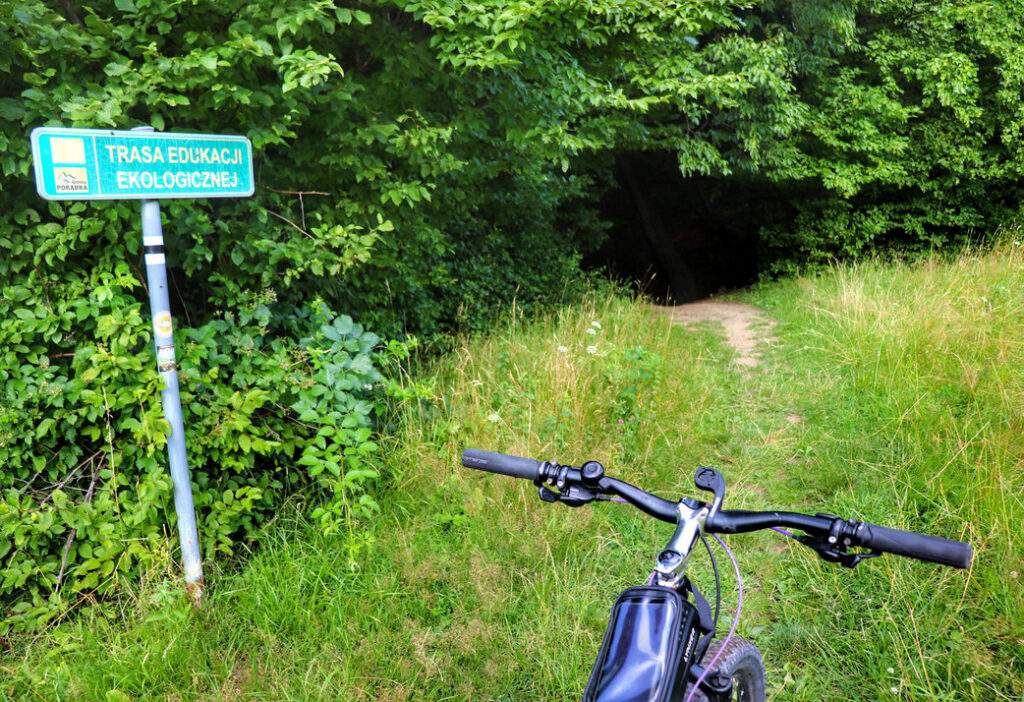 Po krótkiej przerwie ruszyliśmy w dół polany (czarny szlak spacerowy), minęliśmy znak „Trasa Edukacji Ekologicznej” i wjechaliśmy do lasu. Musieliśmy zejść z rowerów, ponieważ najpierw czekał nas krótki, ale stromy zjazd, a potem równie krótki, stromy podjazd. Następnie skręciliśmy w prawo na wąską ścieżkę leśną, która prowadziła prosto do ruin Zamku Wołek.