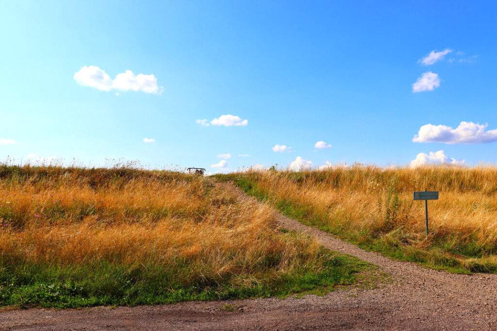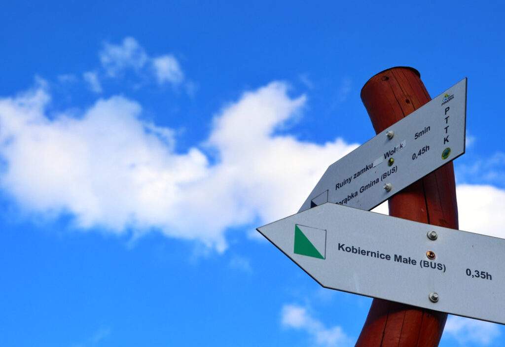 Uwaga! To właśnie tą asfaltową drogą można dotrzeć tutaj z Kobiernic Małych (zielony szlak spacerowy). Drogowskaz w Kobiernicach Małych informuje, że do ruin Zamku Wołek jest stamtąd około 35 minut drogi. Podejście z Kobiernic Małych jest strome, ale cały czas prowadzi wygodną, asfaltową nawierzchnią. My zdecydowaliśmy się na trasę z Porąbki, żeby zrobić pętlę, dlatego zrezygnowaliśmy z wjazdu i zjazdu tą samą drogą.