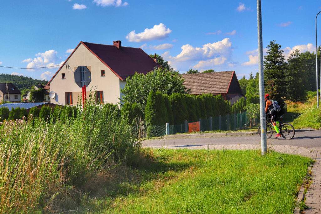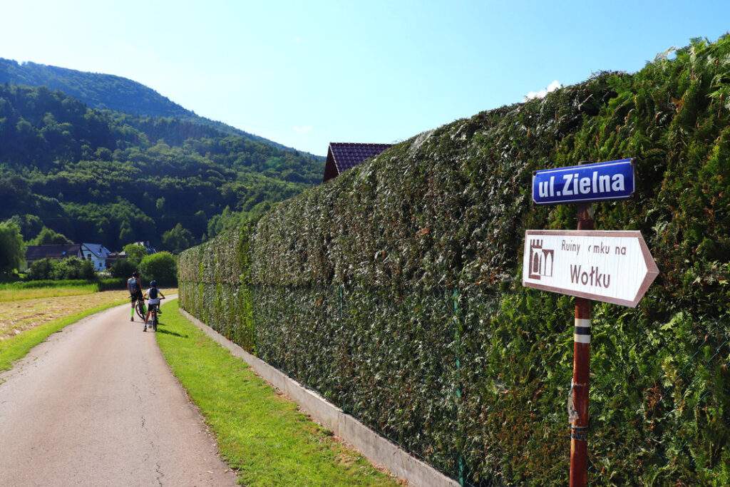Po przejechaniu mostu skręciliśmy w prawo i jechaliśmy wzdłuż ulicy Bielskiej (droga wojewódzka nr 948) przez około 500 metrów. Następnie, przy czwartym zjeździe, skręciliśmy w lewo w ulicę Zamkową. Poruszaliśmy się poboczem, pomiędzy domami. Po kolejnych 300 metrach droga rozdzielała się – ulica Zamkowa prowadziła w prawo, natomiast my wybraliśmy drogę biegnącą w lewo, czyli ulicę Zielną.