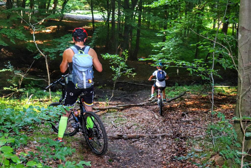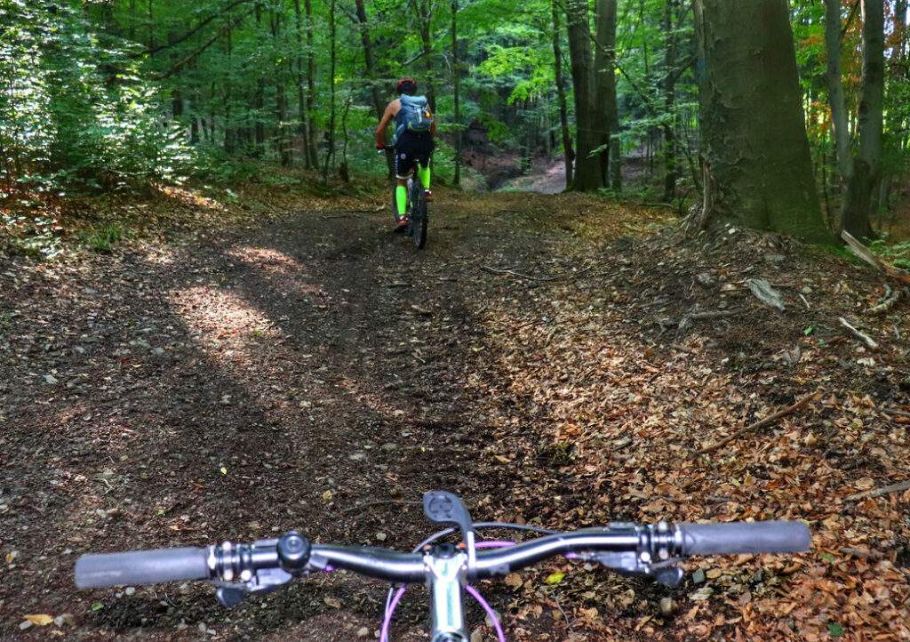 3 km – Skręciliśmy w lewo i czekał nas długi, mozolny i stromy podjazd przez las. W kilku miejscach musieliśmy podprowadzać rowery, bo nawierzchnia po ostatnich opadach była dość wymagająca – pełno było błota i licznych wybojów. Po drodze minęli nas chłopcy na rowerach elektrycznych, dla których ten odcinek nie stanowił większego wyzwania.
