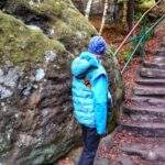 Dziecko wędrujące po drewnianej kładce przy wysokiej skale - Szczeliniec Wielki